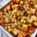 Grease a baking dish and transfer the stuffing mixture evenly. Bake in the preheated oven for about 30 minutes or until the top turns beautifully golden brown. This final crisp adds a delightful contrast to the soft interior.