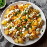 This Buffalo Chicken Roasted Potato Bake is a flavorful and hearty dish that combines crispy roasted potatoes with tender buffalo-marinated chicken, topped with melted cheddar and Monterey Jack cheese. Perfect for game days or family dinners, it offers a wonderful balance of spicy, cheesy, and savory flavors with a creamy touch of sour cream and fresh green onions.