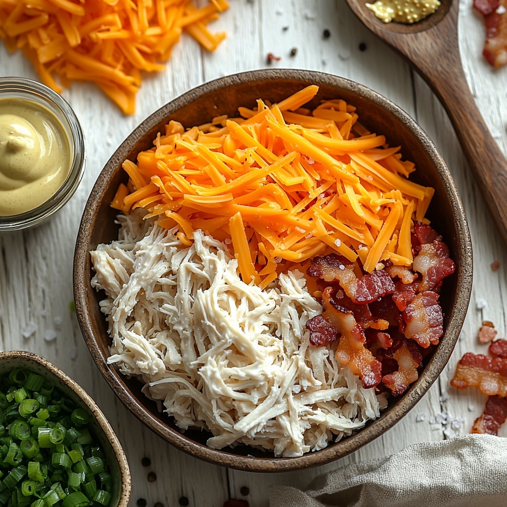 - Combine Chicken Ingredients: In a large bowl, mix together the shredded cooked chicken, crumbled bacon, shredded cheddar cheese, and chopped green onions until well combined.