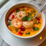 This Creamy Thai Shrimp Coconut Curry Soup is a vibrant and comforting dish featuring succulent shrimp simmered in a rich coconut milk broth infused with red curry paste, fresh ginger, garlic, and lime. Balanced with vegetables like bell peppers, mushrooms, and spinach, and served with tender rice noodles, it’s a quick and flavorful meal that brings authentic Thai flavors to your table.