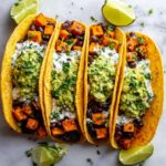 These Crispy Chipotle Sweet Potato Tacos with Lime Crema feature perfectly spiced and roasted sweet potatoes paired with smoky poblano peppers, black beans, and melty Mexican cheese, all tucked into crunchy grain-free hard shell tacos. Topped with a tangy, creamy lime crema and fresh cilantro, jalapeño, and mashed avocado, this vibrant dish offers a delightful balance of smoky heat, creaminess, and fresh zest, ideal for a flavorful vegetarian meal.