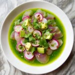 Fresh and Zesty Mexican Aguachile is a vibrant, citrus-marinated seafood dish featuring thinly sliced yellowtail fish soaked in a tangy blend of lime juice, serrano chiles, cilantro, and other fresh ingredients. This refreshing ceviche-style recipe is perfect for warm days and showcases bold Mexican flavors with a spicy kick and creamy avocado garnish.