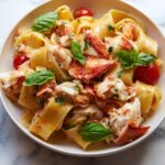 This Lobster Pasta recipe combines tender lobster meat with a creamy Parmesan sauce, fresh cherry tomatoes, and garlic, all tossed with perfectly cooked fettuccine. Offering a rich yet comforting seafood pasta dish, it’s ideal for an elegant dinner or special occasion. Ready in just 35 minutes and serving four, it delivers a delightful balance of creamy texture and fresh flavors, garnished with aromatic basil.