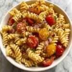 In a large mixing bowl, toss together the cooked pasta, charred corn, halved cherry tomatoes, diced red onion, and chopped cilantro. This mixture bursts with colors and textures that promise a lively eating experience.