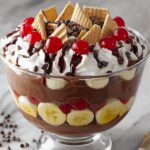 This No-Bake Chocolate Banana Split Trifle is a delightful and easy-to-make dessert featuring layers of creamy chocolate pudding, fresh bananas, whipped cream, crunchy graham crackers, chocolate chips, and maraschino cherries. It requires no baking and is perfect for a quick yet impressive treat that can be prepared ahead of time and chilled for one hour before serving.