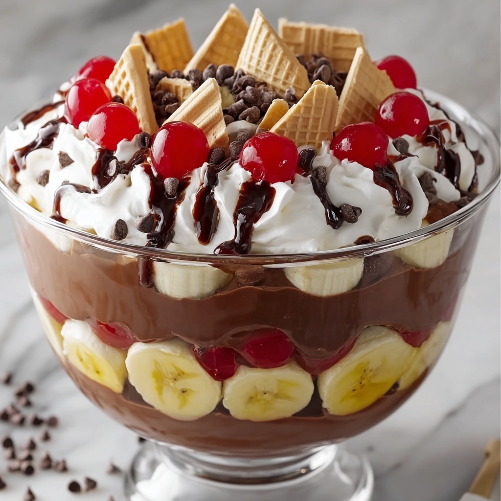 Serving this No-Bake Chocolate Banana Split Trifle Recipe in individual glass jars or stemmed dessert bowls adds a personal, elegant touch. You could even layer it in clear parfait glasses to showcase each delicious step. For parties, consider adding edible flowers or a sprinkle of toasted coconut for a festive twist.