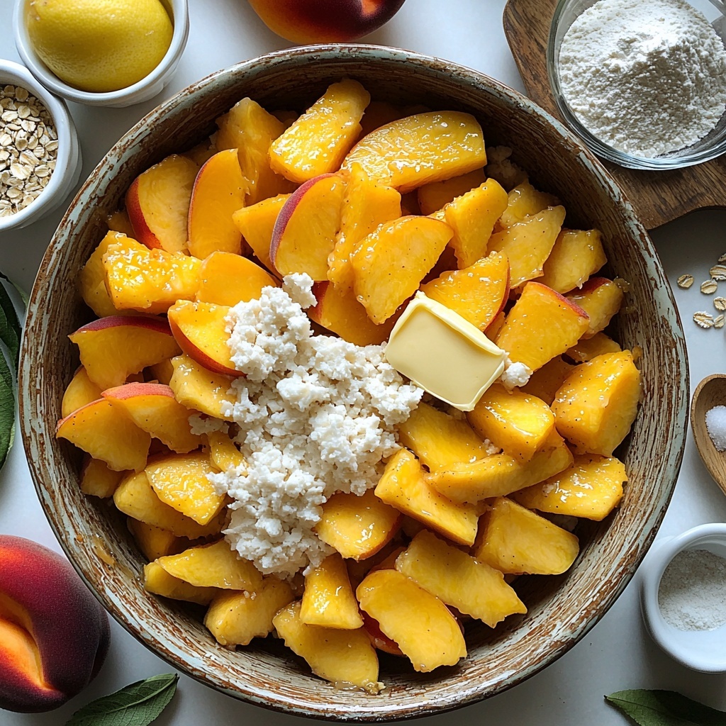 In another bowl, toss the peeled and sliced peaches with granulated sugar, lemon juice, and cinnamon. This mixture will soak up just the right amount of sweetness and spice, ensuring the peaches remain juicy and flavorful during baking.