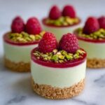 Delight in these elegant Raspberry Pistachio Mousse Cakes featuring a crunchy pistachio almond crust, a luscious pistachio mousse layer, tangy raspberry compote, and a light raspberry cream topping. Perfect for a sophisticated dessert that’s both visually stunning and irresistible in flavor.