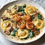 This delightful seafood ravioli dish combines succulent shrimp and scallops with fresh spinach and shiitake mushrooms, all brought together in a rich and creamy garlic sauce. Perfectly cooked four-cheese ravioli are gently tossed in a luscious sauce made with heavy cream, vegetable broth, and Parmigiano-Reggiano for an indulgent yet balanced seafood pasta dinner ready in just 30 minutes.